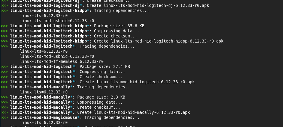 This causes abuild to call the _splitmod function in the build script for every module generated by the kernel build. Then in this function a bit more information is required to create the package: